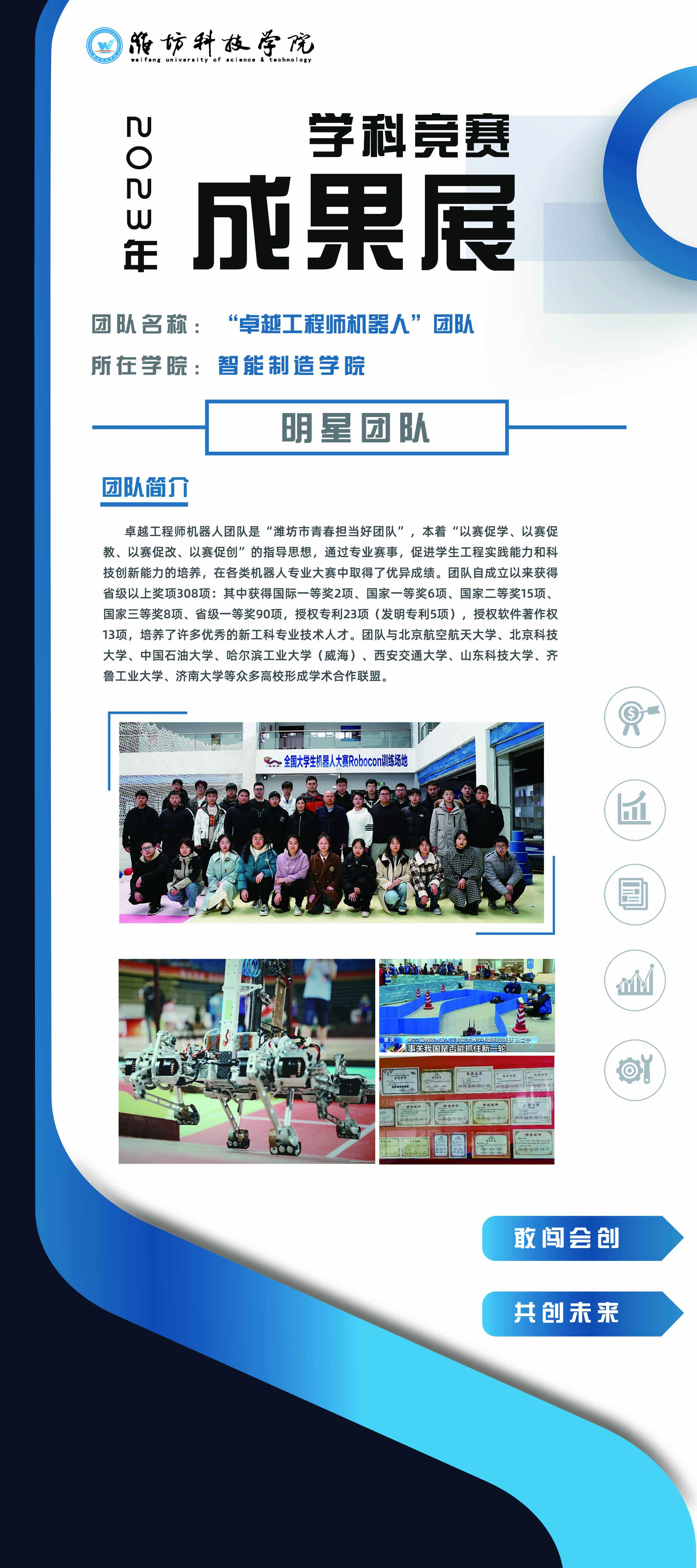 卓越工程师机器人团队是“潍坊市青春担当好团队”,本着“以赛促学、以赛促教、以赛促改、以赛促创"的指导思想,通过专业赛事,促进学生工程实践能力和科技创新能力的培养,在各类机器人专业大赛中取得了优异成绩。团队自成立以来获得省级以上奖项308项:其中获得国际一等奖2项、 国家一等奖6项、 国家二等奖15项、国家三等奖8项、省级一等奖90项,授权专利23项(发明专利5项),授权软件著作权13项,培养了许多优秀的新工科专业技术人才。团队与北京航空航天大学、北京科技大学、中国石油大学、哈尔滨工业大学(威海)、西安交通大学、山东科技大学、齐鲁工业大学、济南大学等众多高校形成学术合作联盟。